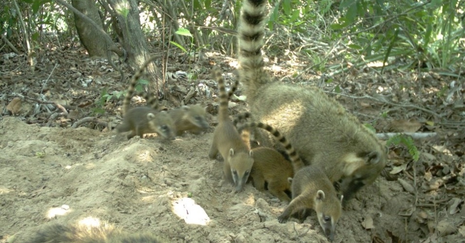 Uma família de quatis também foi fotografada procurando por sua presa em um monte de areia na entrada da toca do tatu.