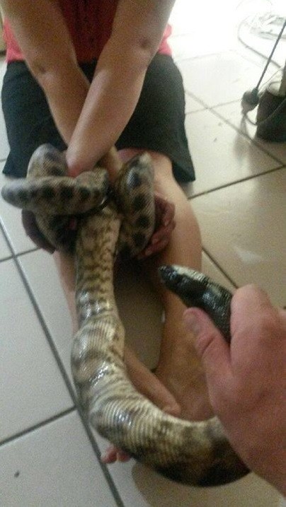 insólita situação, já que a mulher não conseguia se livrar da píton, que