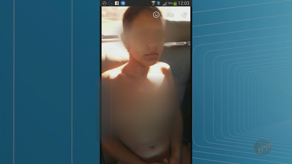 sobrancelha da vítima, que já está com a cabeça toda raspada.
