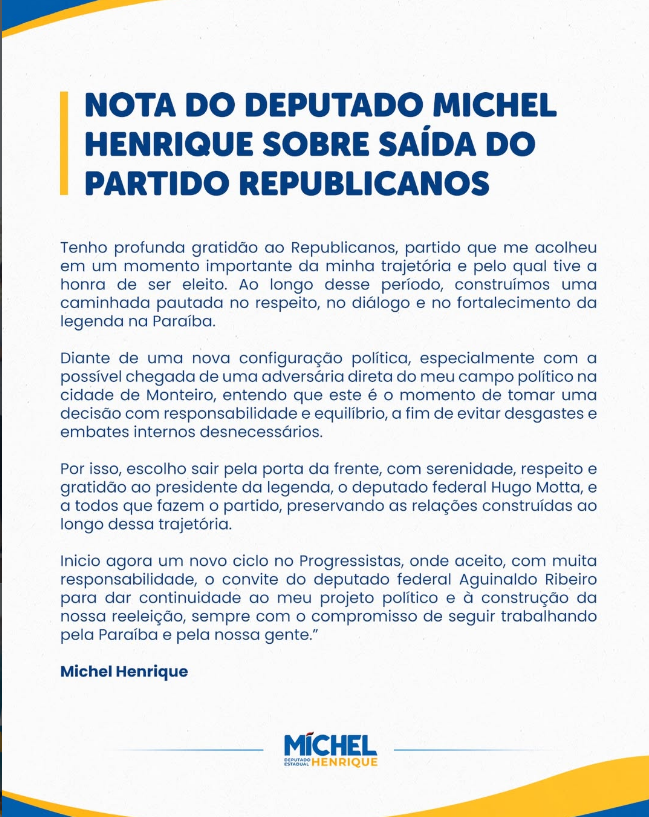 Em nota, Michel destacou a gratidão ao partido que o acolheu e pelo qual foi eleito, ressaltando que sua trajetória foi marcada pelo respeito, diálogo e fortalecimento da legenda na Paraíba.